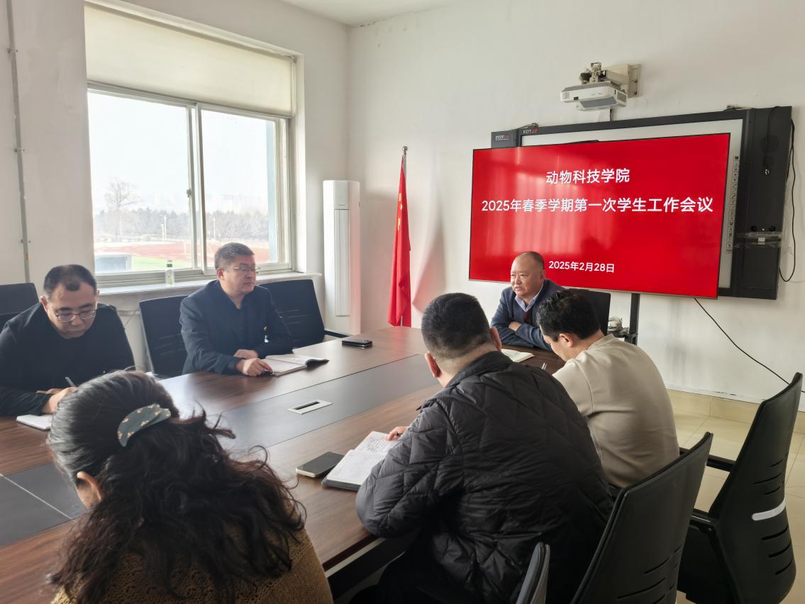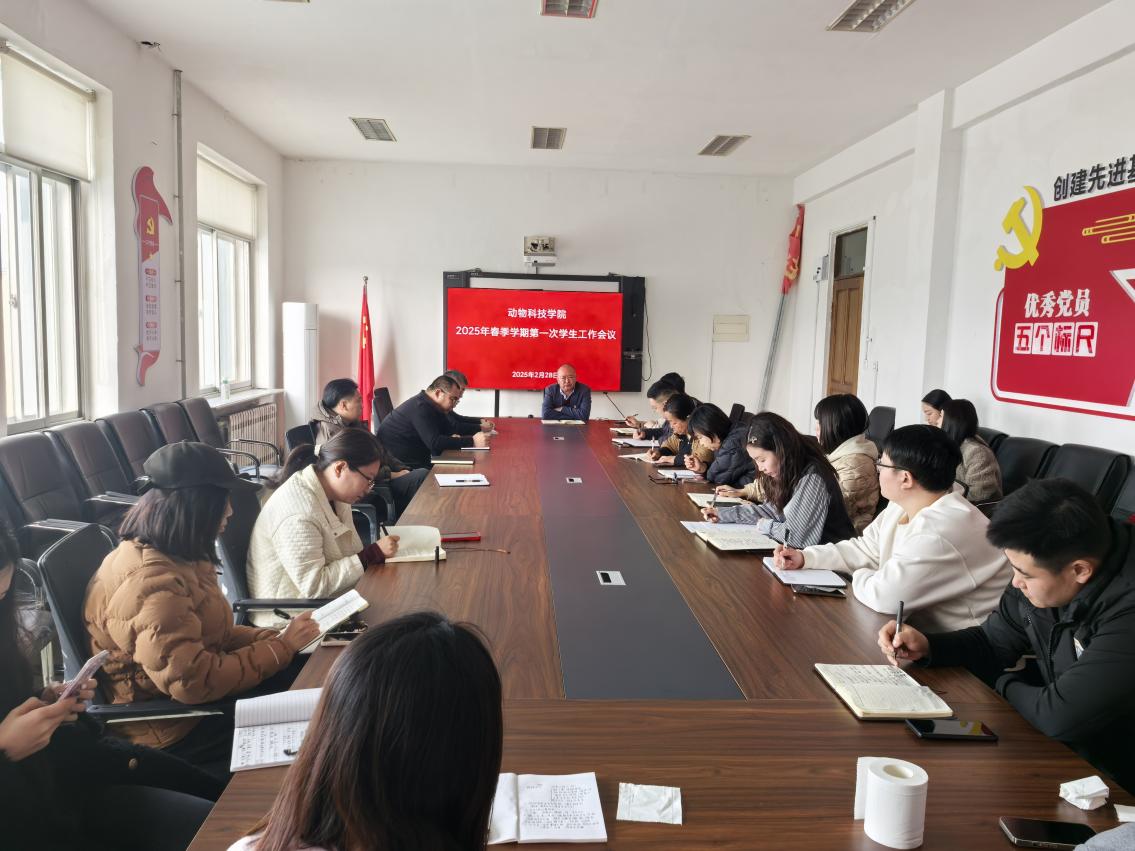 2025年2月28日上午9:00,动物科技学院于办公楼二楼会议室召开2025年春季学期第一次学生工作会议,由王维江书记主持,学院全体辅导员、班主任参加会议。