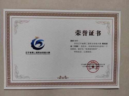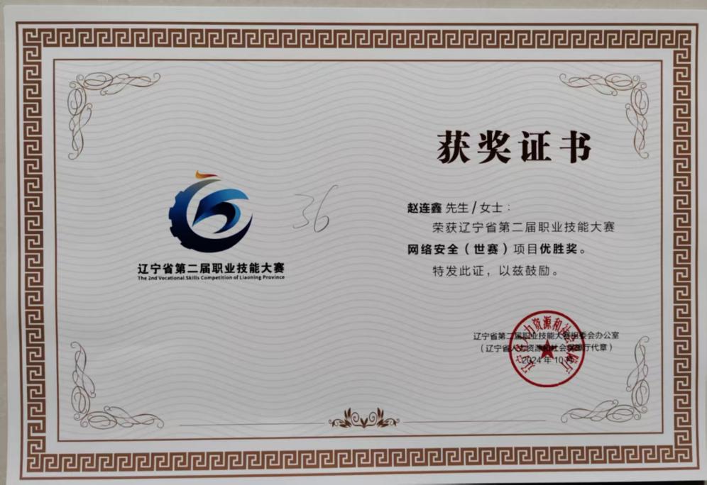 信息科技学院于2024年10月参加的由辽宁省人社厅组织的辽宁省第二届职业技能大赛网络安全(世赛)项目中,信息安全技术应用专业教师吴庆指导的铁岭1队(赵连鑫、张祥)以414分取得第4名的好成绩,荣获“优胜奖”,吴庆老师被评为“优秀指导教师”。希望全体师生积极进取、勇于创新,为学院争得更多荣誉。