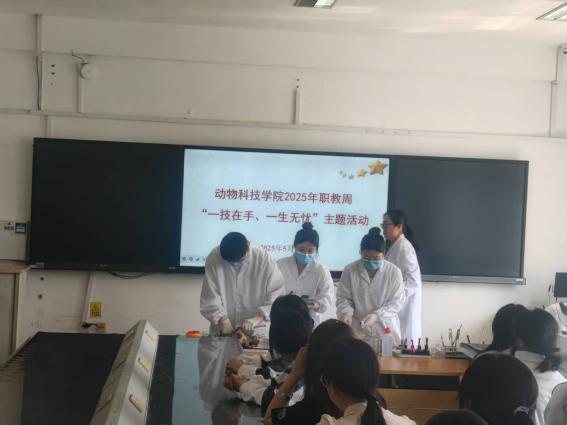 动物科技学院举办动物疫病检疫检验技能展示活动。参赛学生深入阐释了动物疫病检测技术原理,在技能展示区,同学们熟练运用“看、听、摸、检”四步检查法,从规范的样本采集到无菌操作,每一个步骤都严谨细致,展现出精湛的解剖技艺和敏锐的观察力。