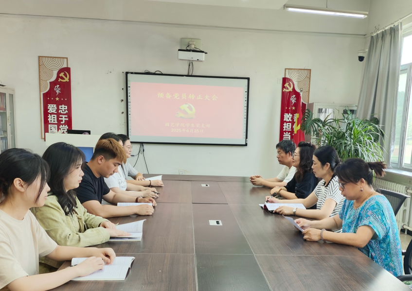 2025年6月25日,园艺学院学生党支部在党员活动室召开了预备党员转正大会,讨论并表决刘一等5名预备党员的转正问题。