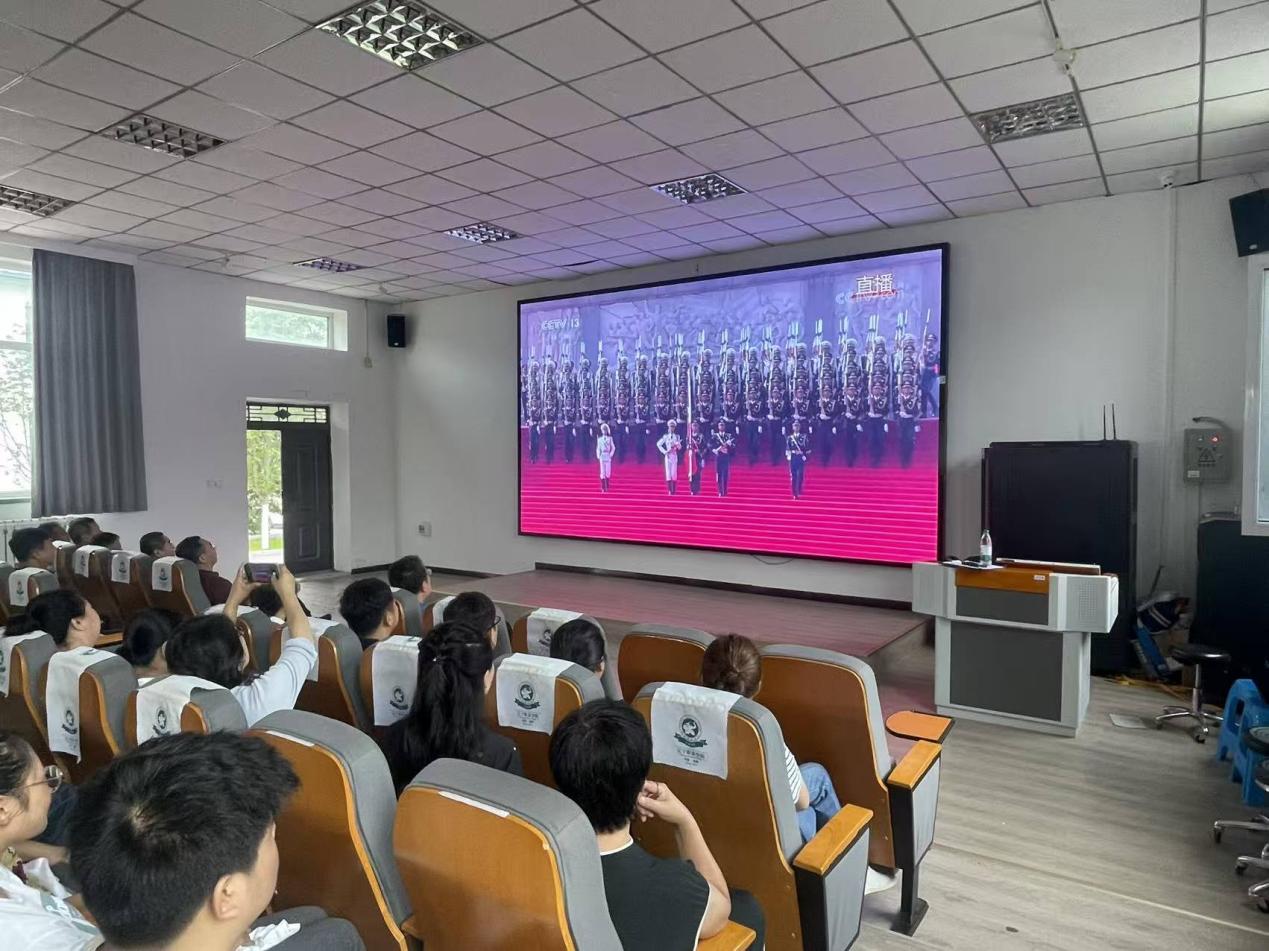 上午 9时,阅兵仪式正式开始,师生们全神贯注地注视着大屏幕。当整齐划一的徒步方队迈着坚定的步伐走过天安门广场,当先进的装备方队展示着我国国防科技的最新成果,当空中梯队以威武的姿态呼啸而过,教室里不时响起阵阵掌声和惊叹声。