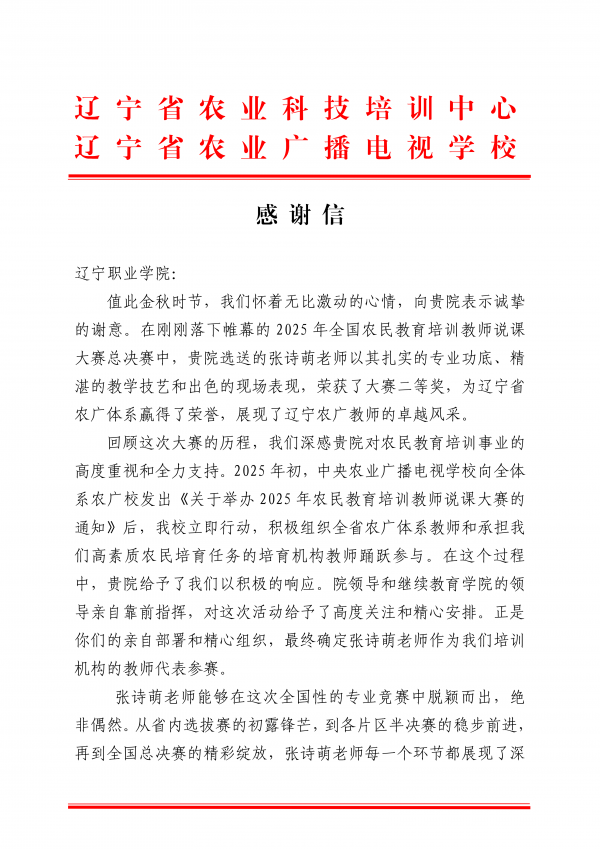 辽宁省农业科技培训中心(农广校)在感谢信中特别强调,张诗萌老师能够在全国大赛中斩获佳绩,离不开Beat365中文官方网站在前期遴选、赛前指导等各环节的高度重视与专业支撑。信中指出,Beat365官网的周密组织与高效协同,为教师顺利备战、取得佳绩奠定了坚实基础,充分彰显了Beat365官网在师资培育与培训体系构建方面的领先实力。