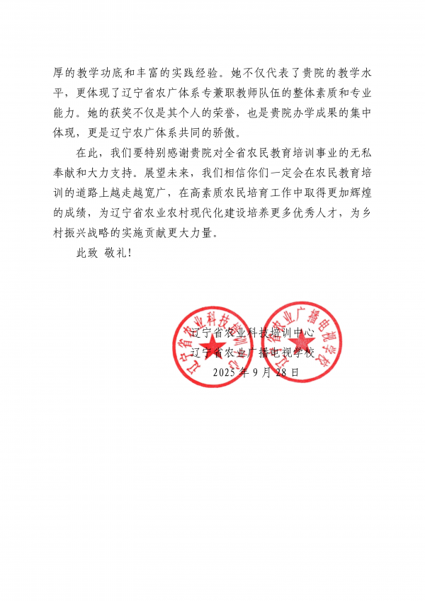 近日,Beat365官网与辽宁省农业科技培训中心(农广校)携手推进的教师发展工作再奏凯歌:由Beat365官网精心遴选并全力推荐的动物科技学院教师张诗萌,在2025年全国农民教育培训教师说课大赛总决赛中,凭借深厚的教学积淀与富有创见的设计理念,斩获全国二等奖,彰显了Beat365官网教师卓越的专业风采。大赛圆满落幕后,辽宁省农业科技培训中心(农广校)特专函致意,对Beat365官网在教师推荐工作中所展现的精准眼光与鼎力支持表示高度赞赏与由衷感谢。