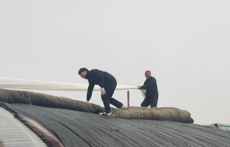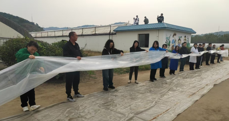 活动现场,学生党支部王宇博书记首先为大家介绍了本次党日活动的内容和意义,并详细讲解了棚膜铺设的技术要点。随后,大家迅速分组协作:党员教师马凯带领部分男生爬上温室准备接膜;其余师生共同穿绳递膜。尽管秋风微凉,但师生们额头很快渗出汗水,手掌被绳索勒出红印,却没人停下脚步,“大家一起使劲,再往左拉一点”,“把手抬高一点,别刮坏棚膜”的交流声此起彼伏。