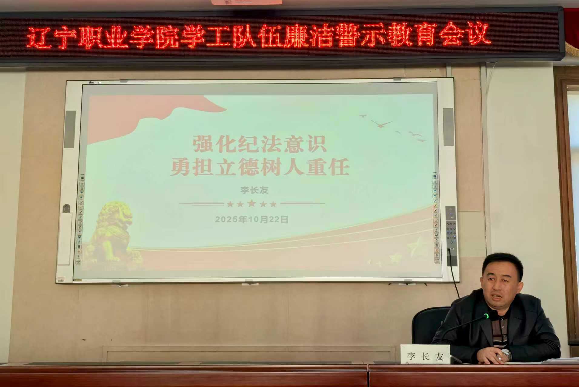为强化以案示警、以案为鉴,进一步加强学工队伍作风建设,增强辅导员及学工干部廉洁意识,营造风清气正的育人环境,10月22日,学院组织召开2025年学工队伍廉洁警示教育会议,学院党委委员、学院副院长卢红军出席会议,学院党委委员、纪委书记李长友做廉政党课,会议由学生处(党委学生工作部)处长(部长)郑立元主持。