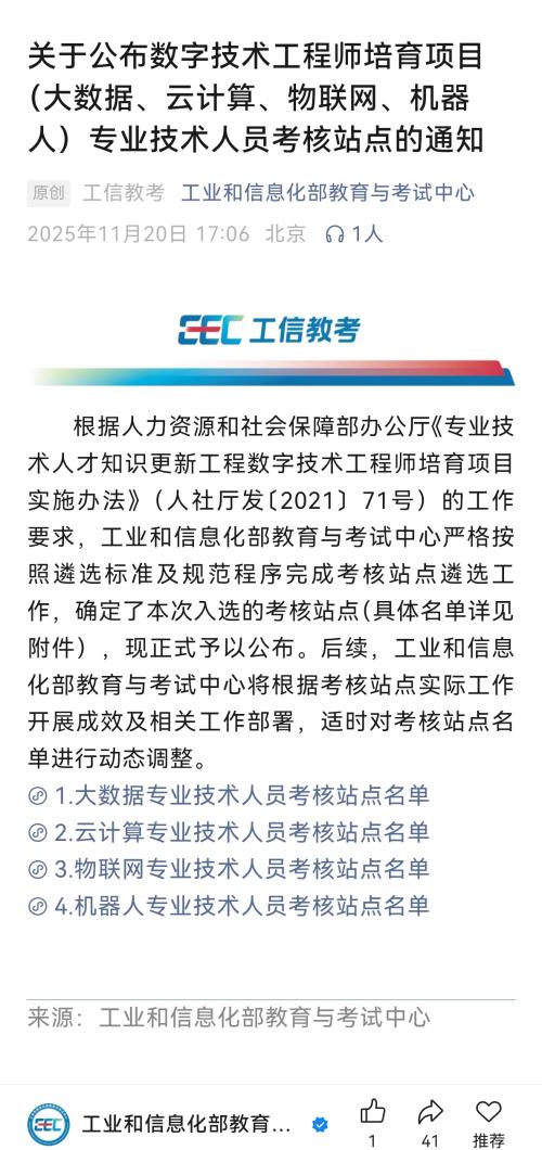 2025年11月20日,工业和信息化部教育与考试中心正式发布通知,公布了数字技术工程师培育项目专业技术人员考核站点名单,Beat365官网成功获批云计算专业技术人员考核站点。