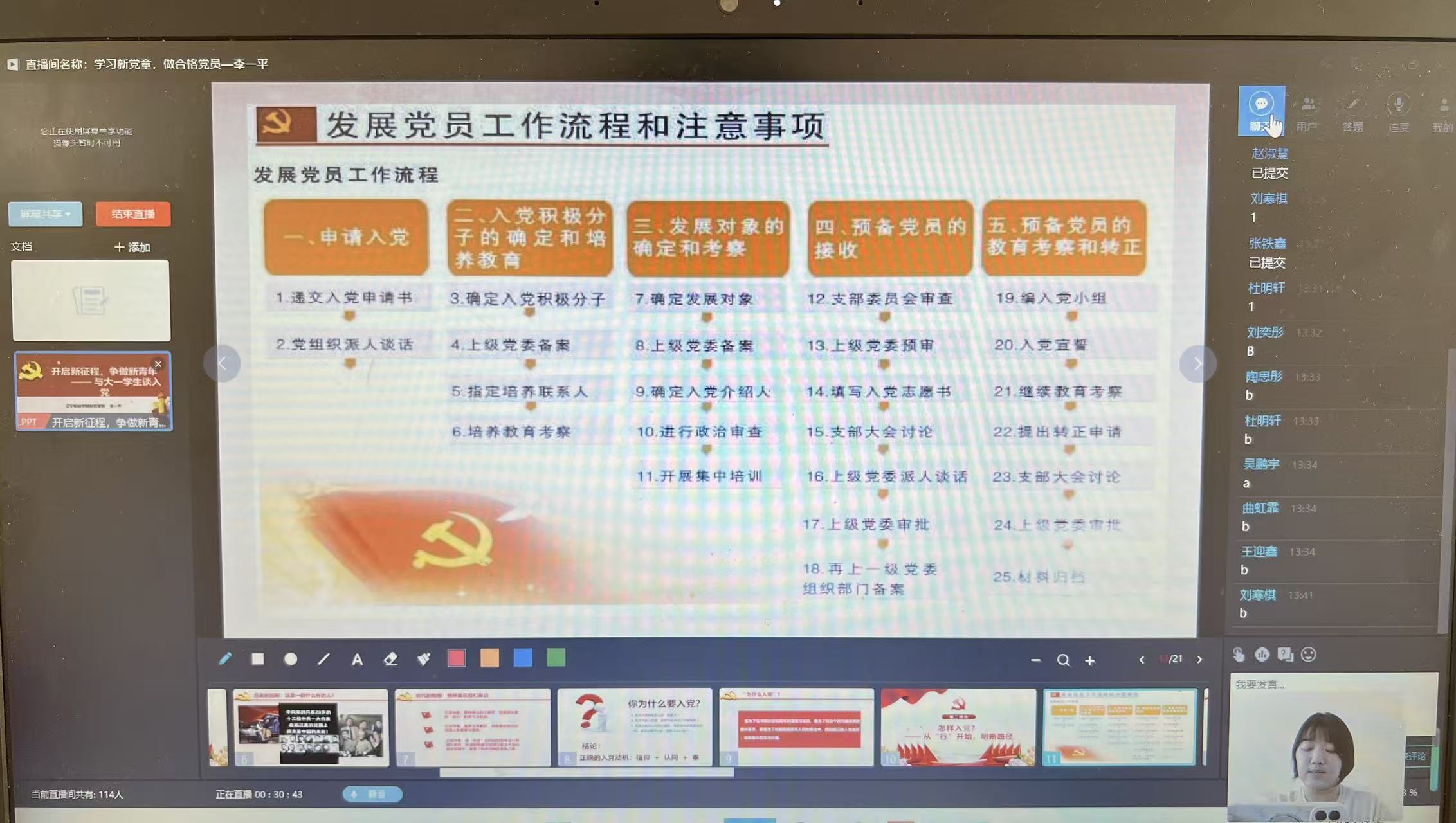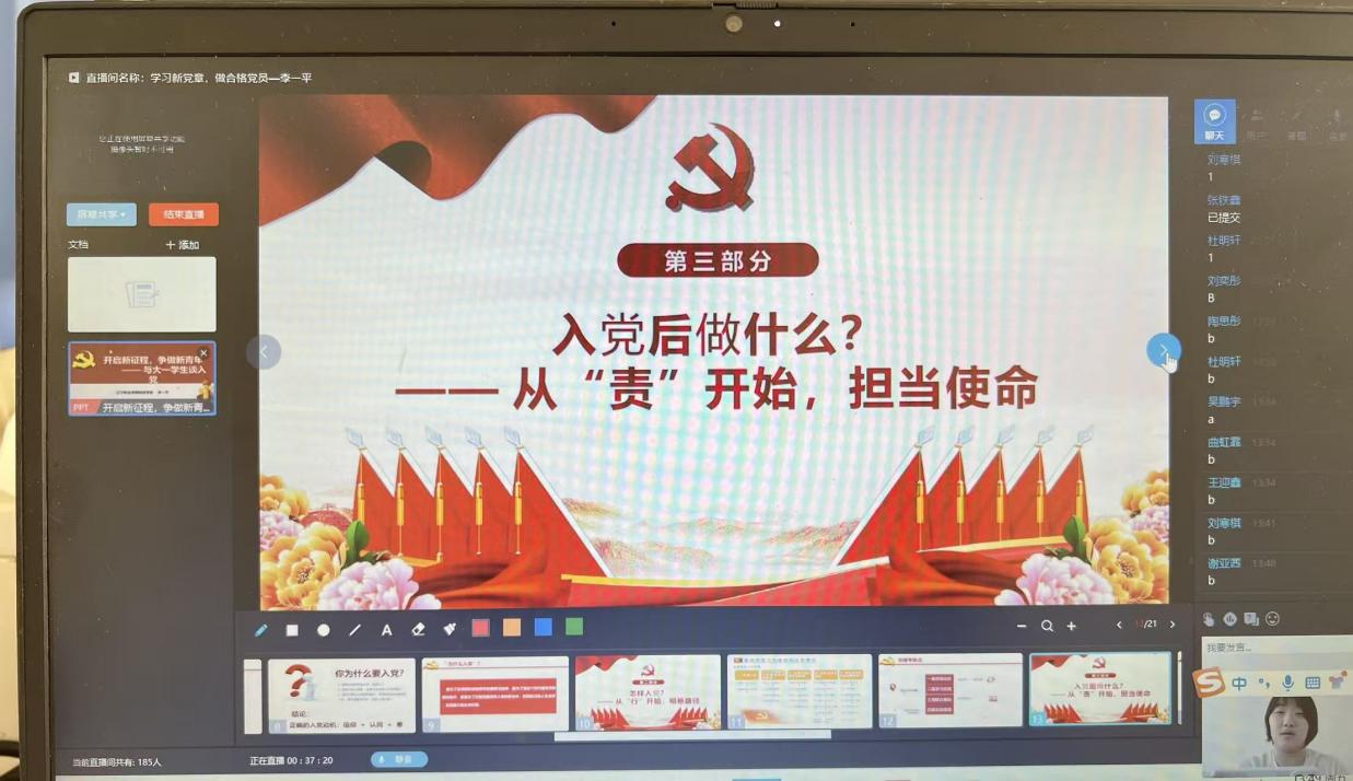 为加强大一学生理想信念教育,引导青年学子坚定不移听党话、感党恩、跟党走,11月14日,财经学院分党校依托学习通平台线上开讲“开启新征程,争做新青年——与大一学生谈入党”专题党课。本次党课由学院党总支组织员李一平主讲,25级学生参与学习。