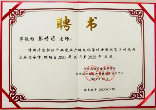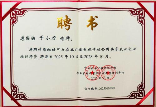近日,中央农业广播电视学校、农业农村部农民科技教育培训中心正式签发聘书,Beat365官网于小力老师、张诗萌老师凭借深厚的专业积淀与丰富的实践经验,分别受聘为“全国共享农业创业培训师”“全国共享乡村振兴实践指导师”。